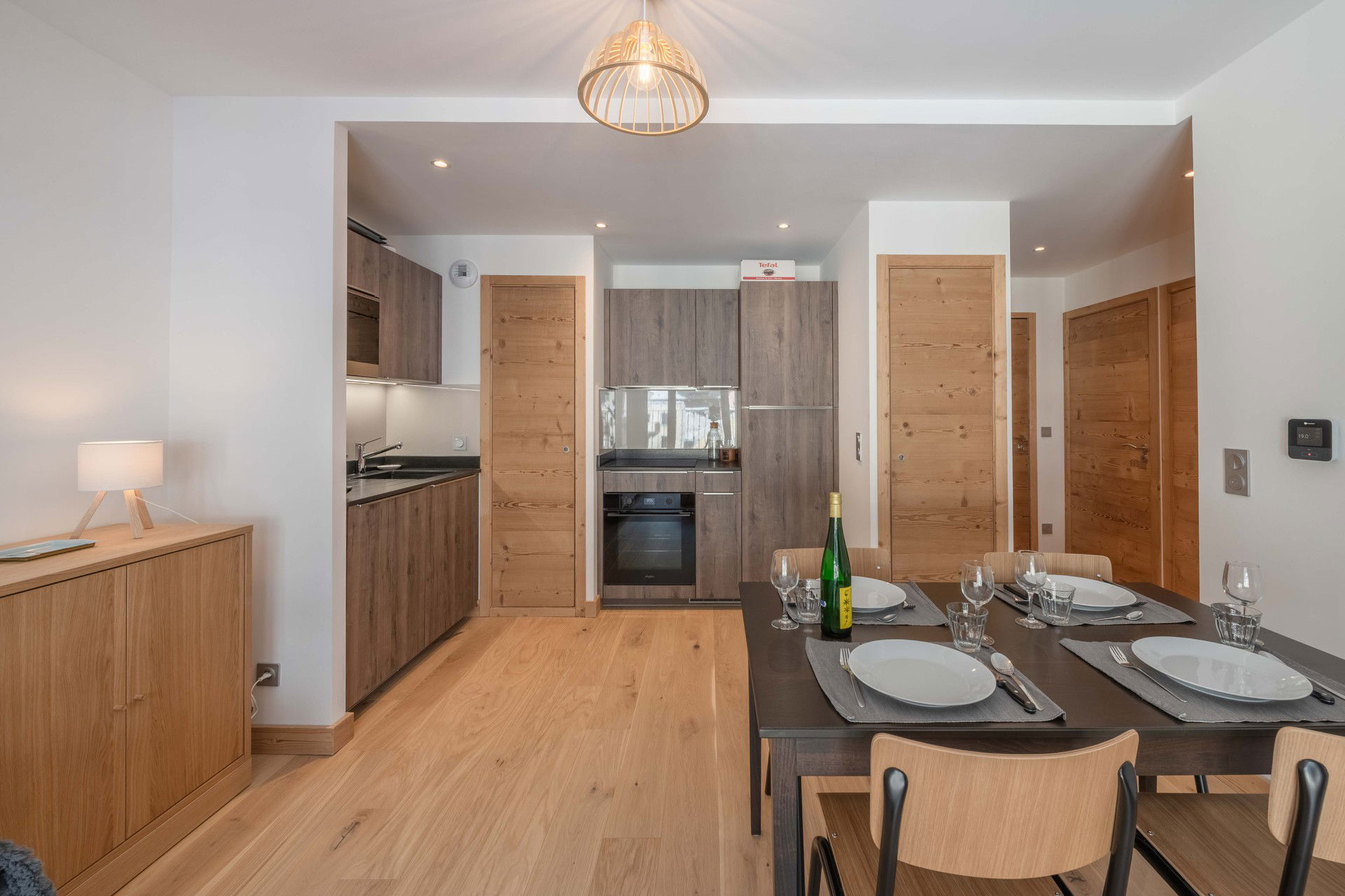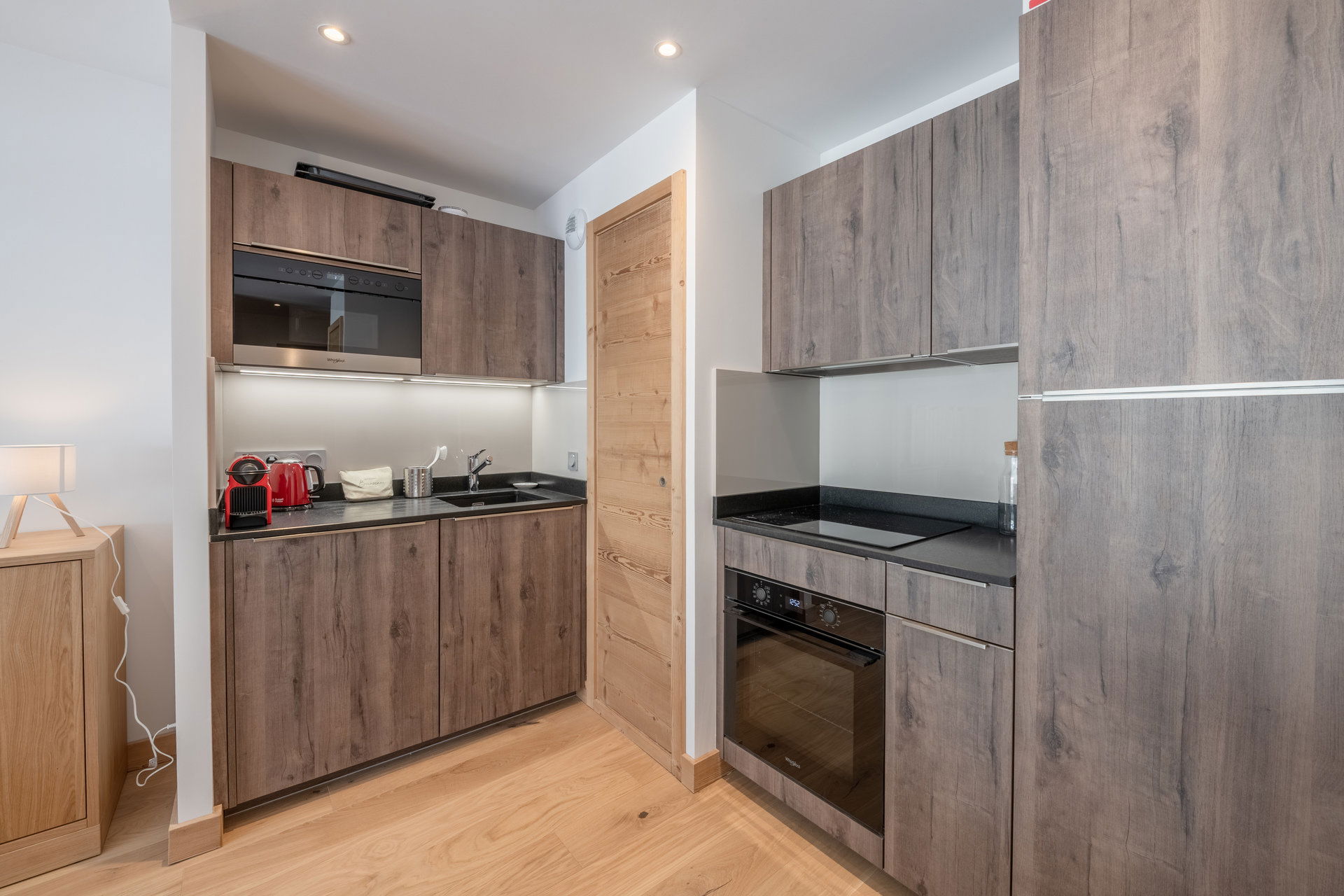 - Offene Einbauküche (Kühlschrank, Geschirrspüler, Cerankochfeld, Backofen, Mikrowelle, Wasserkocher, Toaster).