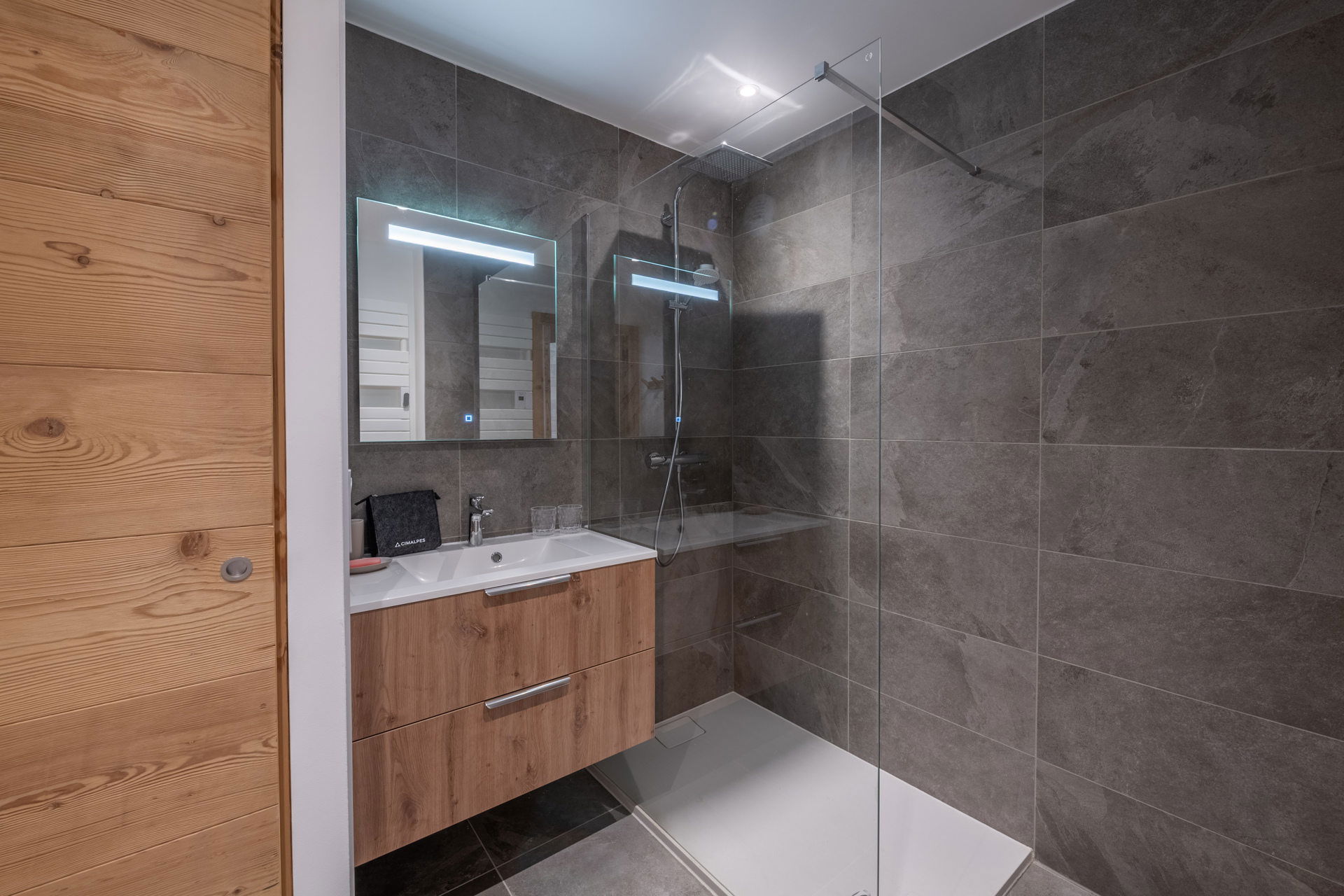 - Badezimmer mit ebenerdiger Dusche, Waschbecken und Handtuchwärmer