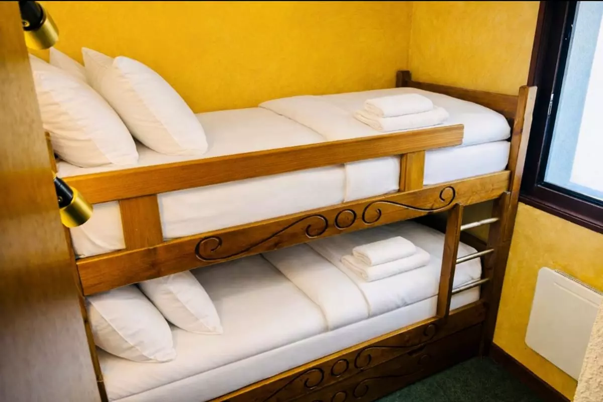 Es bietet jeglichen Komfort und umfasst ein Schlafzimmer mit einem 80x190 cm großen Etagenbett, ein funktionales Duschbad, eine voll ausgestattete Küche und einen Wohnbereich mit einem 160x200 cm großen Schlafsofa.