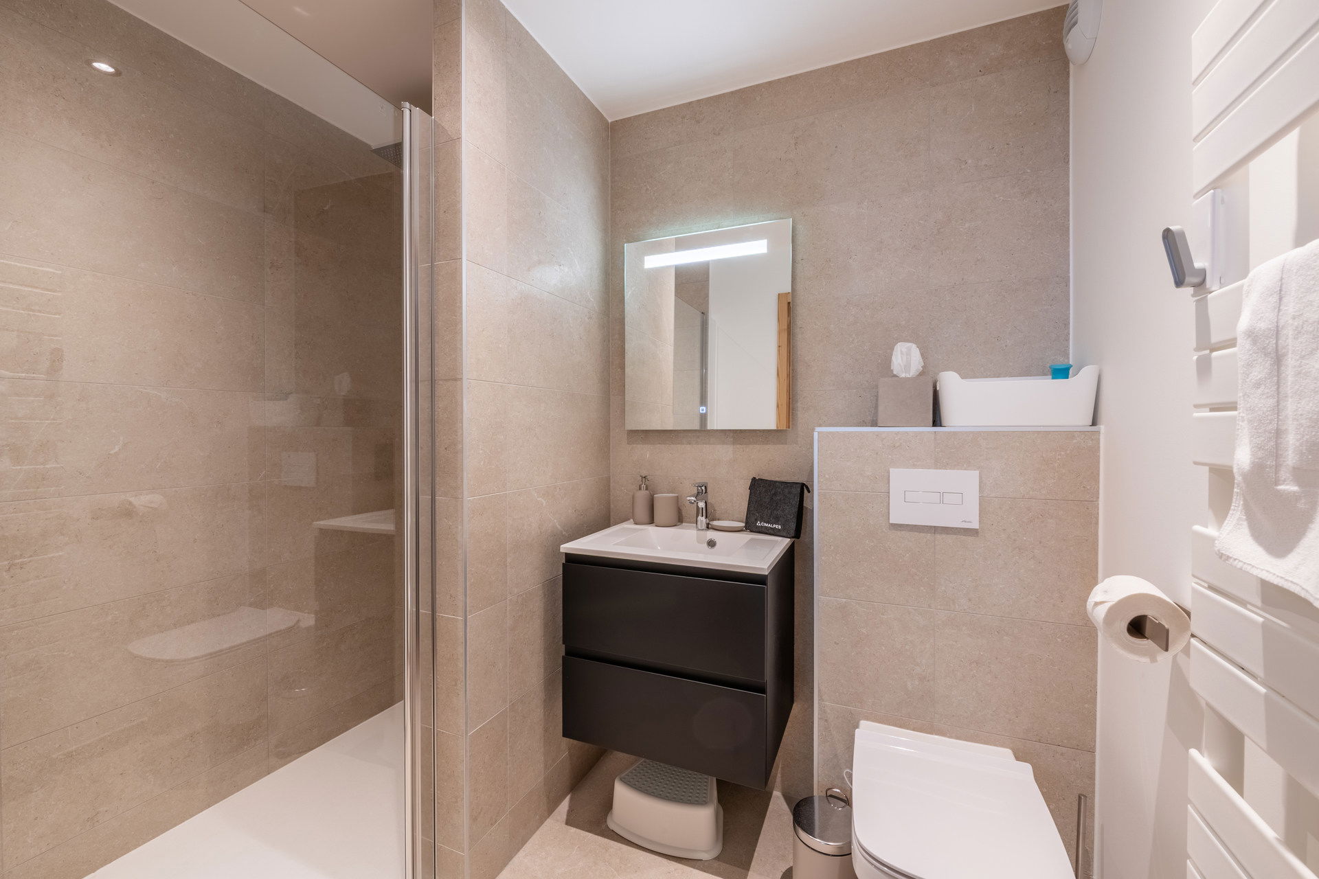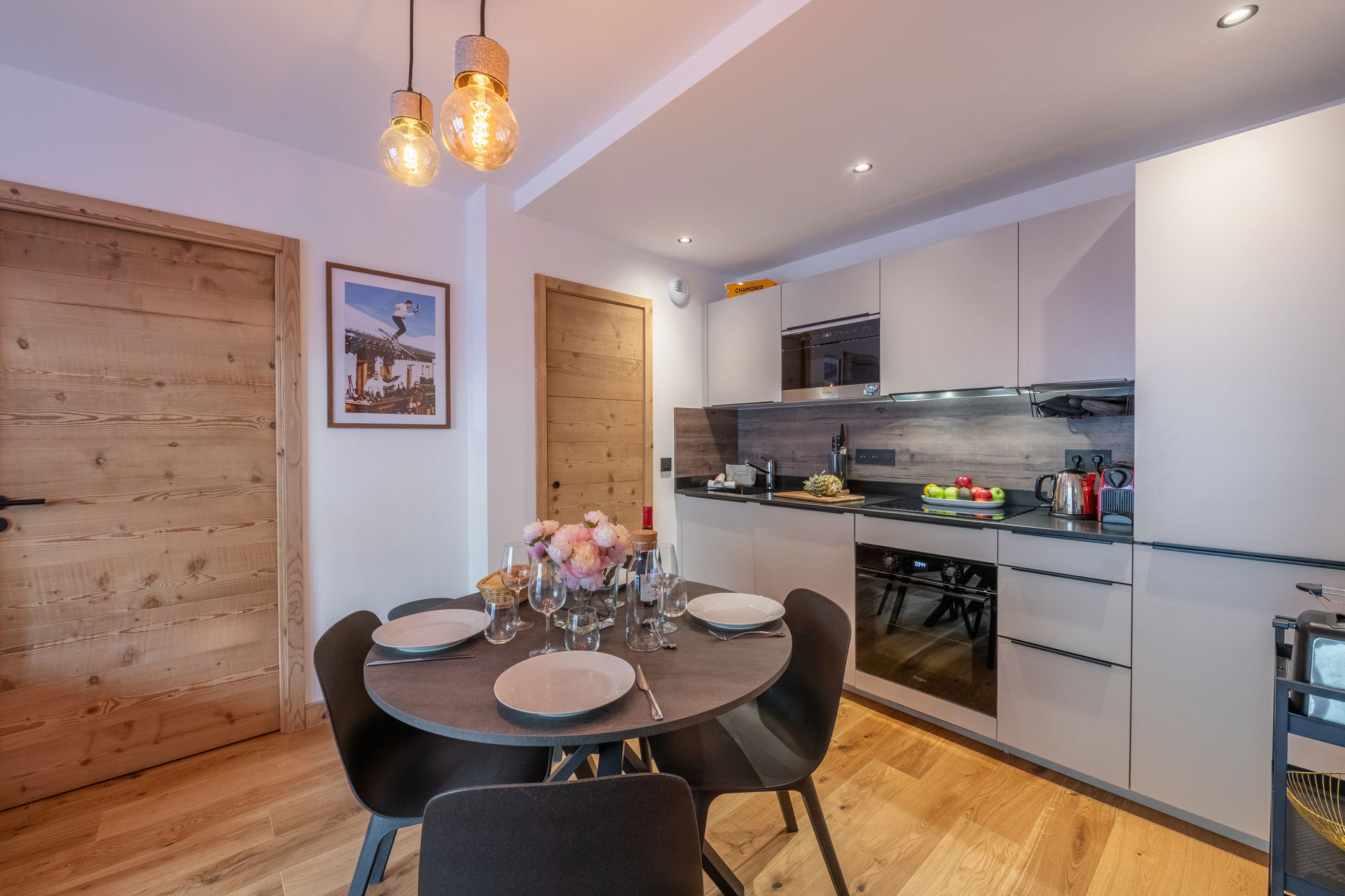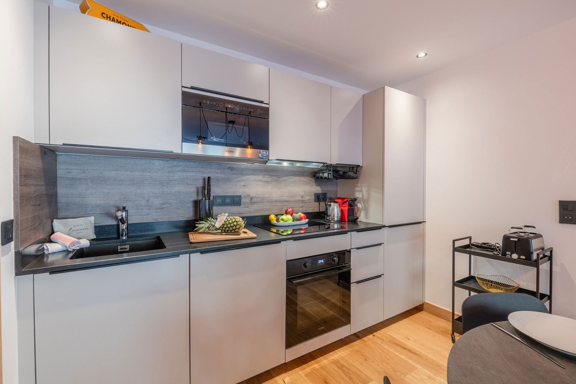- Voll ausgestattete offene Küche (Kühlschrank, Geschirrspüler, Induktionskochfeld, Backofen, Mikrowelle, Wasserkocher, Toaster, Nespresso).